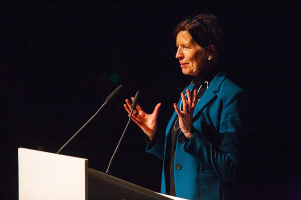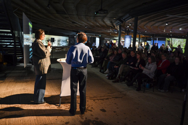 Jeanette Schmitz, Gasometer Geschäftsführerin und Kuratorin von "Mythos Wald", begrüßt im Gasometer die 750 geladen Gäste der Vernissage.