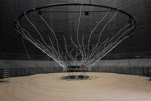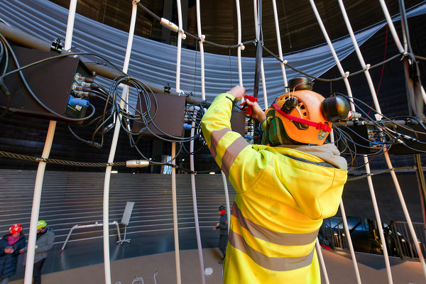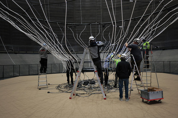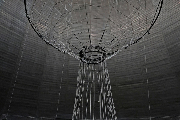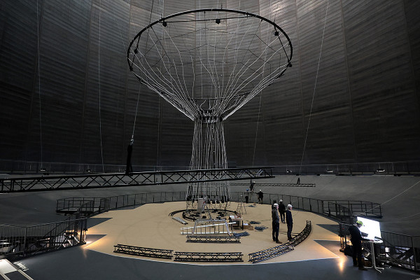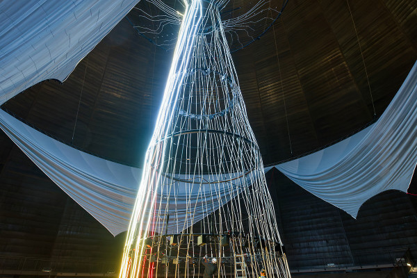 Unser Baum entwickelt sich prächtig. Man kann der imposanten Kunstinstallation wortwörtlich beim Wachsen zusehen. Allerdings in umgekehrter Reihenfolge, denn als Erstes wird der Ring für die spätere Krone zusammengesetzt, gefolgt vom ausladenden Stamm. Und so wächst das glanzvolle Werk in den kommenden Wochen weiter und weiter in den Luftraum des Gasometers.